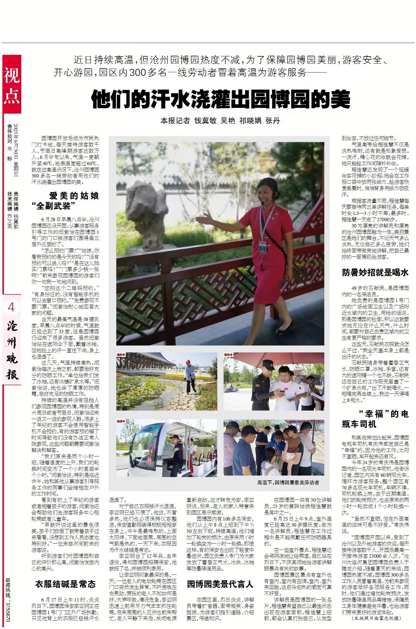 【概要描述】園博園開放后成為市民熱門打卡地,每天接待游客數(shù)千人,節(jié)假日高峰期游客達(dá)數(shù)萬人:6月中旬以來,氣溫一度飆升至40℃,地表溫度超過60℃,就在這高溫狀況下,滄州園博園300多名一線勞動者用他們的汗水澆灌出園博園的美。